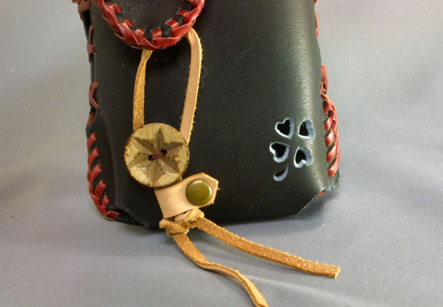 の型抜きもおしゃれ。革ひもは結び位置を変えて長さの調節は自在です。木製のボタンに引っかけて固定します。 |