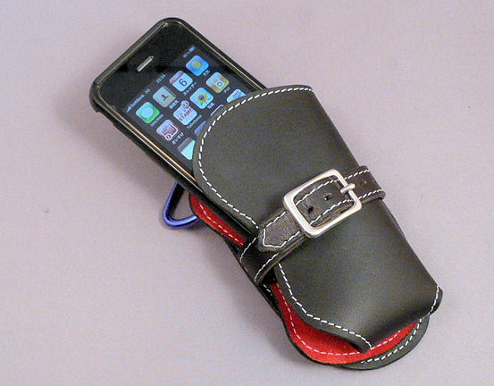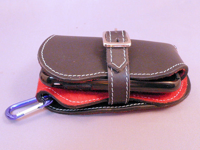 上部には留め金等は作っていません。それはすぐに取り出せるようにしたいからです。製作者本人(私)はこの形状の携帯フォルダーを4年間使っていますが、まだ一度も携帯本体が抜け落ちる事故はありません。
