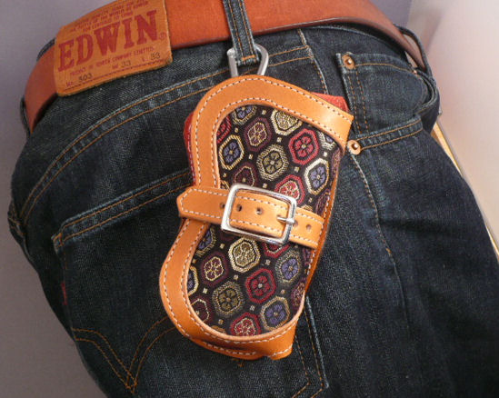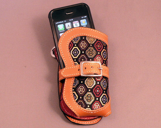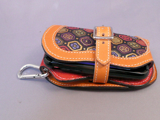 上部には留め金等は作っていません。それはすぐに取り出せるようにしたいからです。製作者本人(私)はこの形状の携帯フォルダーを4年間使っていますが、まだ一度も携帯本体が抜け落ちる事故はありません。
